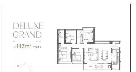 190方户型,四房两厅三卫双套房,T2组合、7米大阳台、9米阔卓厅堂、近55方餐厅,诠释了功能与奢适完美相融