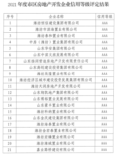 日前,为推进我市房地产市场信用体系建设,规范房地产市场秩序,努力创建诚信规范的市场环境,潍坊市住房和城乡建设局开展了2021年度市区房地产企业信用等级评价工作,并对评价结果进行了公示。在入围的380家评价企业中,AAA级企业28家,AA级企业26家,A级企业305家,B级企业15家,C级企业6家。潍坊泰和置业以第3名的成绩荣获“AAA”级荣誉称号,这份荣誉的到来,既是全体泰和人拼搏实干的结果,也是一份行业肯定,代表着政府和行业对于泰和置业品牌的认同,展现出了企业应用的品牌实力,树立起了良好的企业形象。