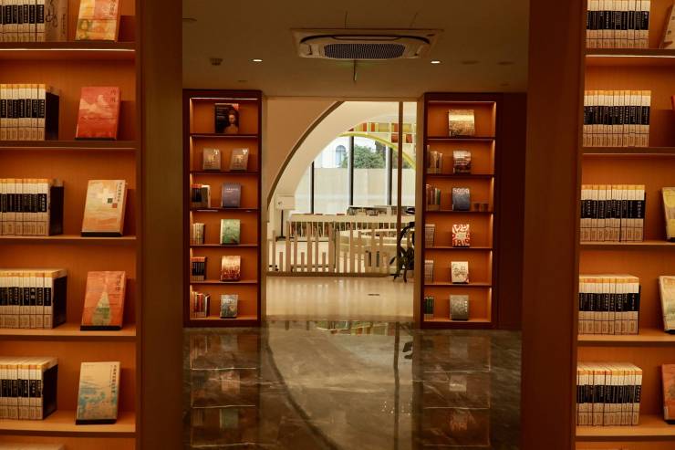 进入书院,首先映入眼帘的是大面积巴西利卡风格的中庭空间,长28米、宽8米、高14米,平面呈长方形,屋顶是穹形,左右两侧是对称的立柱支撑。中庭直通3层,两侧是8个特色主题书架阵列,再向外延伸是阅读大空间。