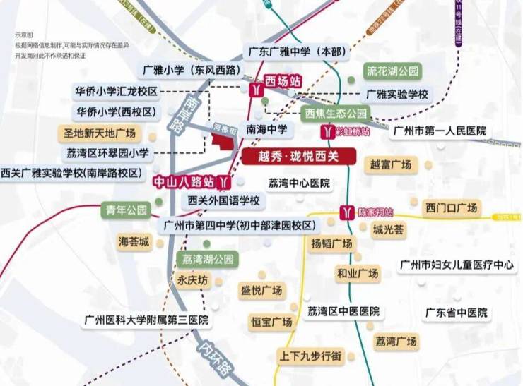 地铁:项目位处老西关板块核芯,临近地铁5/11号线(在建中)中山八站,未来2站陈家祠/纪念堂,3站公园前,零换乘直达珠江新城、琶洲、金融城三大CBD;