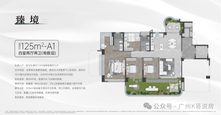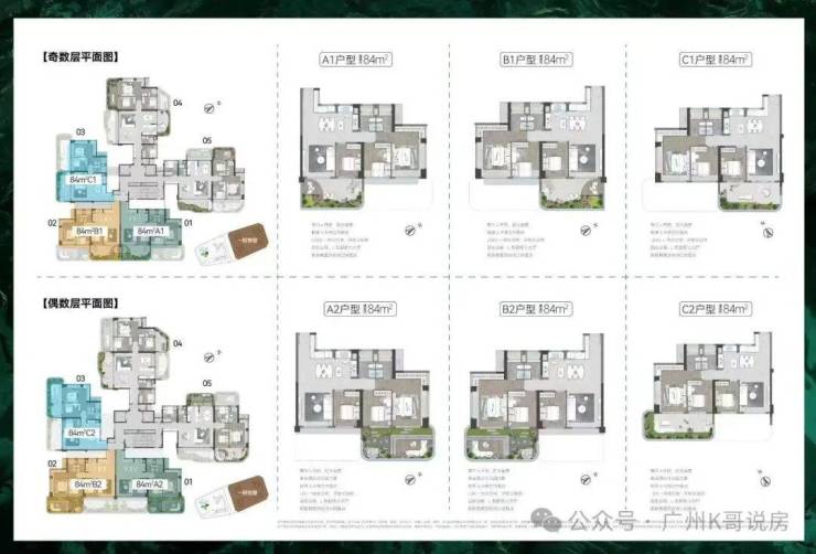 84方奇数层户型,3房2卫,竖厅格局,客厅可以和次卧打通成为一个超级大方厅。四开间朝南,南向面宽去到12.4米。空中花园面积达20㎡。