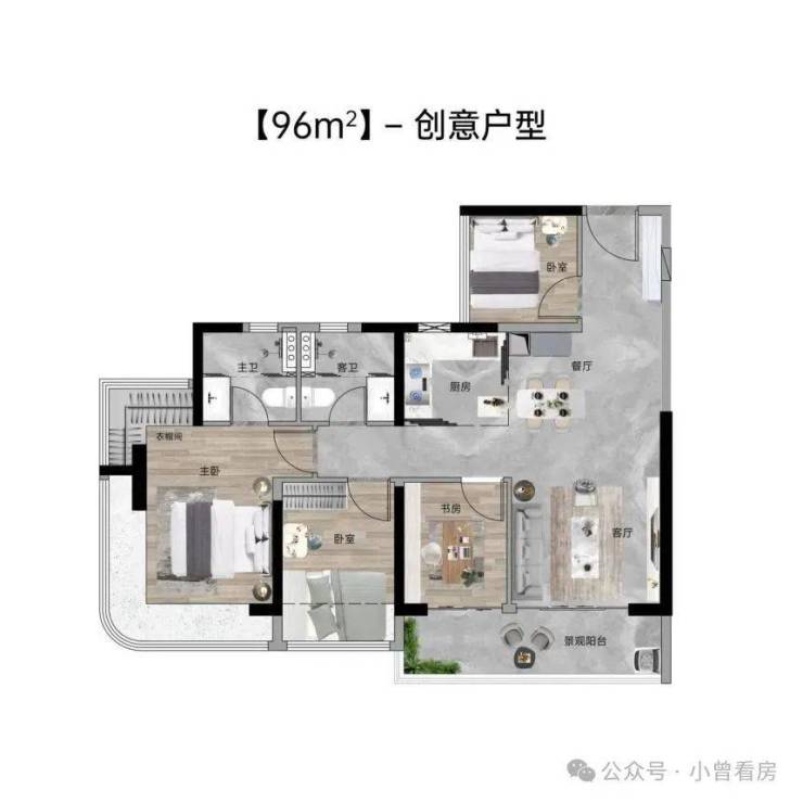 80㎡户型做到三房两卫,四开间朝南,主卧带 270° 弧形飘窗;