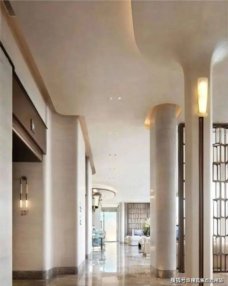入口大门高度达到了约7米,置身其中,尊贵气派。选用贝金米黄石材、维多利亚绿与白雪公主奢石,搭配古铜色金属板,巧妙融合冷暖色调,营造出极具张力的美学效果。