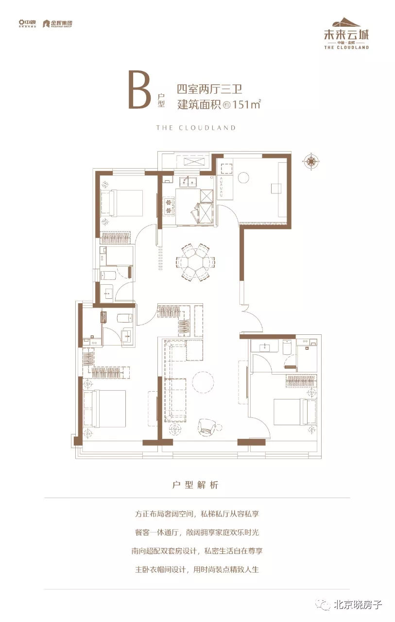 B户型为151㎡四室两厅三卫的方正四居,该户型布局方正、南北通透,明厨明卫、双卧和客厅均朝阳,居住更舒适。北侧为两个次卧中间有厨房相隔,每个卧室均不相邻,保证了每个房间的隐私,互不打扰。南向少有的超配双套房设计,主人和老人都可以有舒适的私密生活。且主卧还有配套的步入式衣帽间,给主人带来更精致的生活。