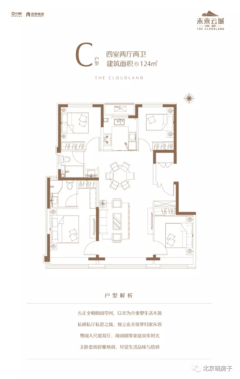 C户型为124㎡四室两厅两卫的方正四居,该户型全明方正、明厨明卫,超大面宽尊享超多阳光。南向为主卧和家人房,中间由客厅相隔,保证了主人房的私密性。主人房为套房,包括独卫卫生间及步入式衣帽间,舒雅格调,尽显生活品味。北向为两个次卧,次卧间有厨房相隔离开来,保证每个房间的私密性。而且厨房和餐厅相连,动线更合理。