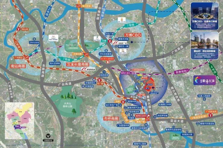 项目坐落万博CBD商圈和市桥商圈双圈辐射区域, 周边有海印又一城、万达广场、天河城等大型商业中心。