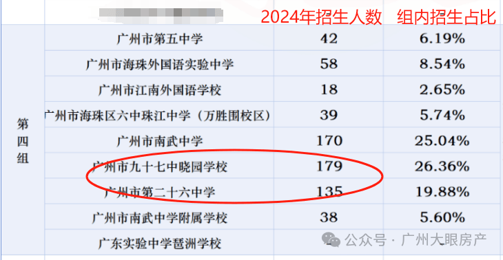 2023年以前,这个分组南武大头,4成学生可以进去,但是到2024年,第四组一共摇679个学位,相对比较差的26中、97中占比提高,一共招生314人,过半的学生进去了这两所学校。
