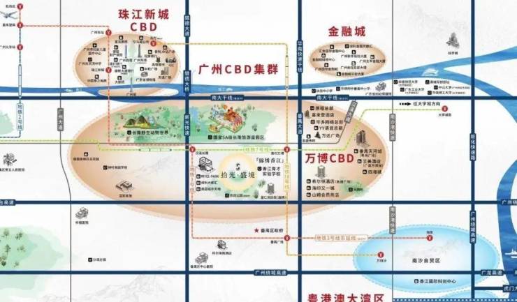 【CBD集群】中轴南拓,万博与珠江新城、琶洲、金融城四足鼎立粤港澳大湾区核心引擎区,广州CBD集群增长极广州城市新中轴线从北到南串联起珠江新城—金融城—琶洲—万博。