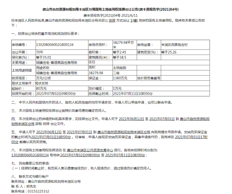 唐山市自然资源和规划局丰润区分局国有土地使用权挂牌出让公告(唐丰资规告字[2021]04号)