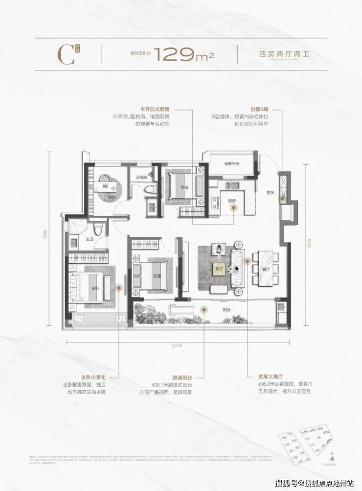建面约129平方米四房两卫和99平方米三房两卫的户型,也都各有亮点。前者具有宽屏大横厅和约9.1米跑道阳台,后者也具有约6.35米的起步双联阳台,视野开阔。