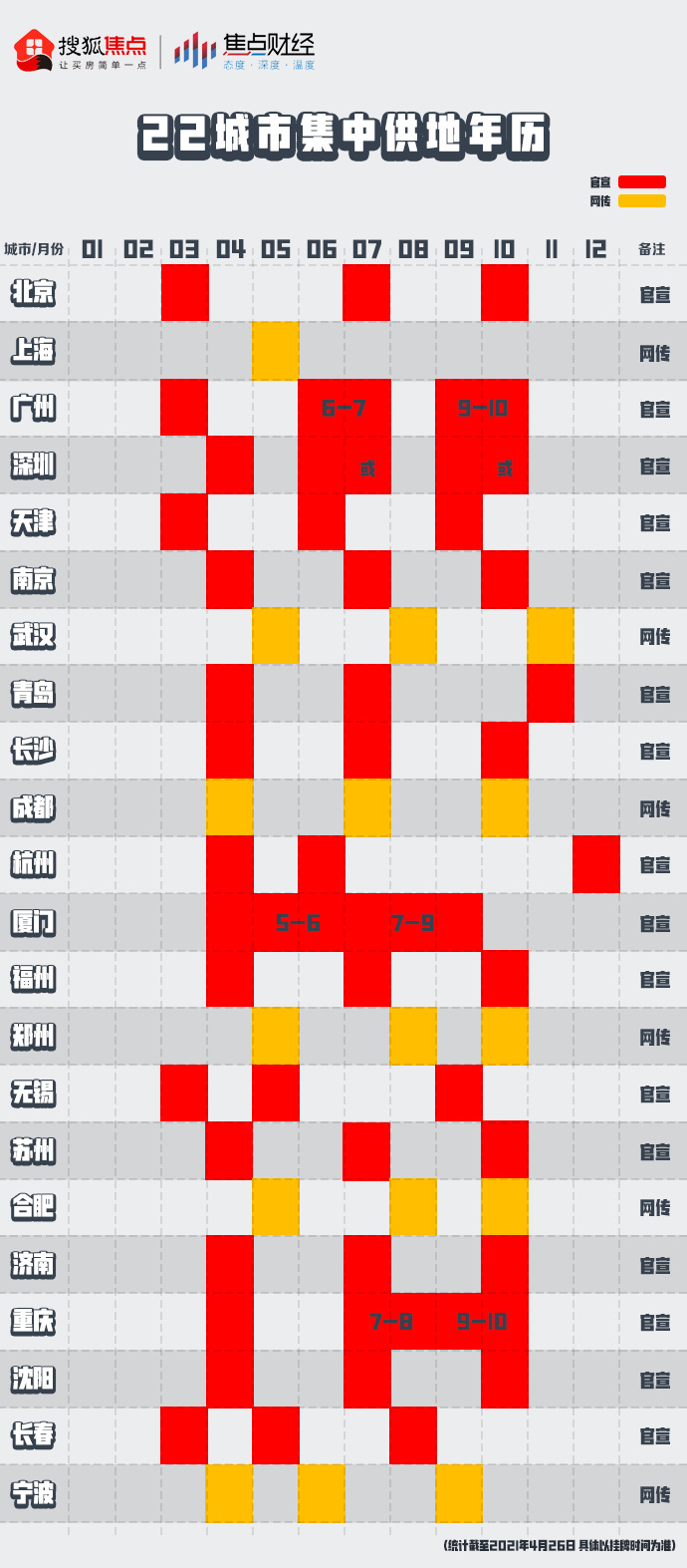 焦点财经讯 据焦点财经统计,截至4月26日,在22个“两集中”供地政策重点城市中,已有16个城市公布202年集中供地日期,分别为北京、广州、深圳、天津、南京、青岛、长沙、杭州、厦门、福州、无锡、苏州、济南、重庆、沈阳、长春。