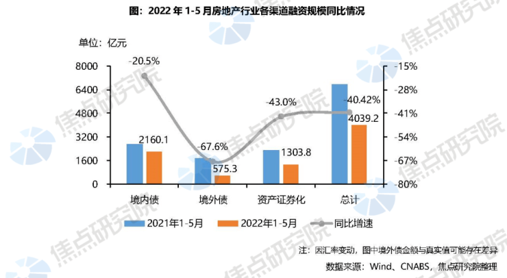 房企融资总额降幅显著收窄。2022年1-5月,房企通过境内债、境外债和资产证券化三个渠道共融资4039.2亿元,同比下降40.4%,降幅较1-4月收窄3.6个百分点。深入各渠道来看,境内债1-5月同比下降20.5%,降幅较1-4月收窄8.6个百分点,不仅降幅在三个渠道中最少,降幅收窄幅度也较高,这是因为民营房企前期融资受阻导致境内发债规模持续下滑,但国企、央企和地方城投平台持续发债成为境内债融资市场的新主力,而随着5月融资政策的持续放松,民营房企重回境内债市场,导致规模出现显著回升趋势。