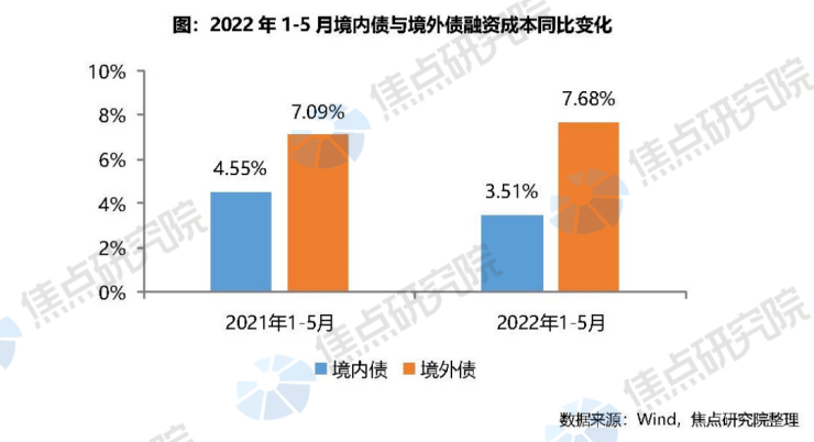 境内债与境外债成本出现相反走势。2022年1-5月,境内债融资算数平均成本为3.51%,同比下降1.04个百分点;境外债融资算数平均成本为7.68%,同比上升0.59个百分点。通过与两个渠道融资规模对比可以发现,境内债融资规模在保持较高水平的同时,成本在持续下降,而境外债融资规模在持续萎缩的同时,成本也在继续升高。这是因为:1、境内债市场中民营房企缺席的份额被央企、国企和地方城投平台补上,这部分企业发债成本通常较低,拉低了境内债的融资成本;2、境外债市场民营房企为发行主力,但受调控影响国内房地产市场活跃度不高,民营房企经营承压,面临较大风险,境外投资者在减少针对内房企的投资外,对于能够发出境外债的民营房企通常也会要求更高的回报率,因此拉升了境外债的融资成本。