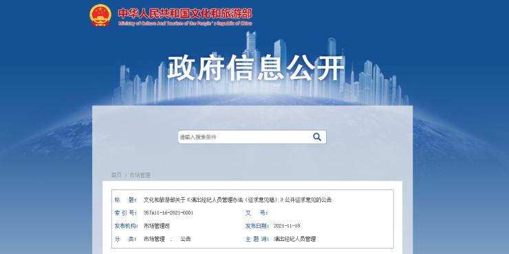 中新网11月19日电 据文化和旅游部网站消息,18日,文化和旅游部发布关于《演出经纪人员管理办法(征求意见稿)》公开征求意见的公告。征求意见稿指出,国家对演出经纪人员实行职业资格认定制度。演出经纪人员不得同时在两个以上单位从业,不得为演员假唱、假演奏提供条件等。