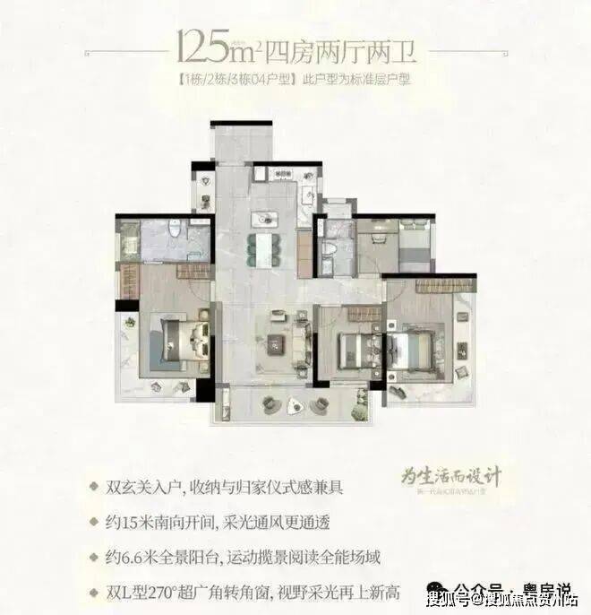 且配备双玄关入户、双阳台、 270°观景飘窗等配置。