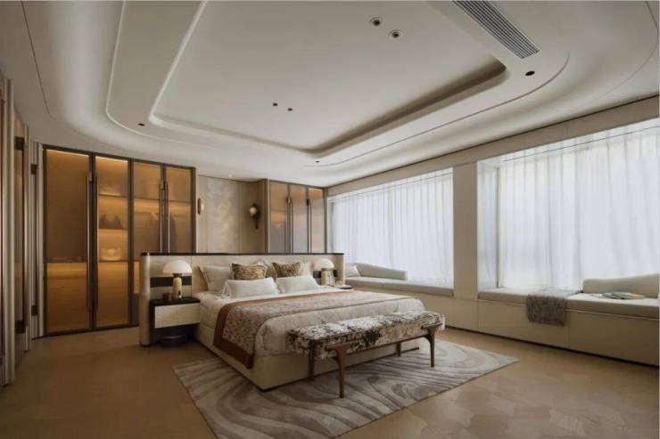 如254㎡户型,大尺度规划三房,将居住舒适度提升至全新境界。11米的客餐厅开间,配合逾60㎡的阔绰公共区域,无论是举办20人的私密晚宴,还是小型的雪茄品鉴会,或是家族聚会,都能从容应对,尽显大家风范。大空间意味着更高的生活自由度。主卧面积突破40㎡,规格甚至超越五星级酒店。这不仅给人带来视觉上的震撼体验,更让日常起居的每个细节都流淌着从容气度。