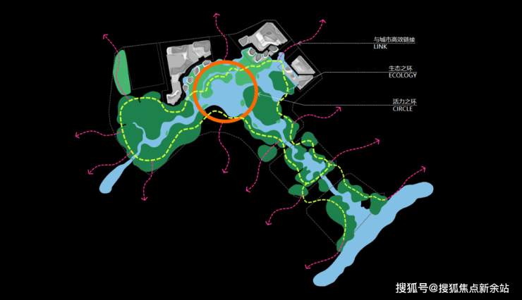 “COASIS”海岸绿洲重建公园生态,重塑公园与城市的关系。打破传统商业模式,营造立体水街商业空间,提升水街两岸商业氛围;双环动线联通,激活片区活力;建筑与环境互融,打造海岸绿洲-COASIS,引领未来商业设计潮流。