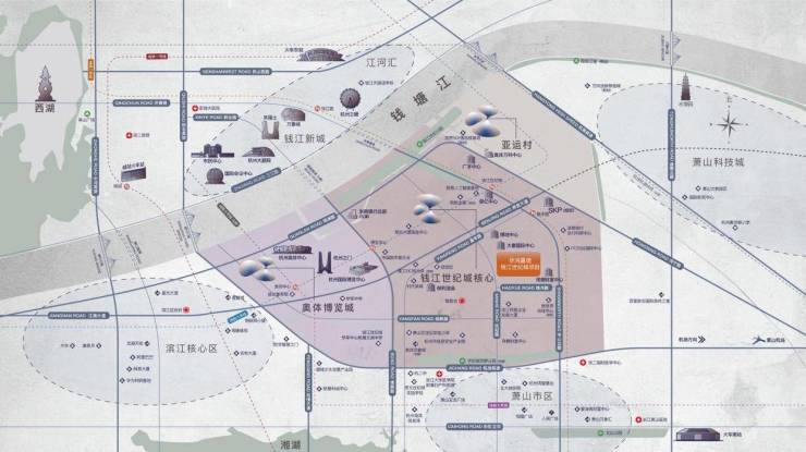 主要的建筑群有杭州奥体中心、杭州国际博览中心、奥体游泳馆等地标建筑,商业有杭州之门、万象世界中心、信达中心等。项目所在便是世纪城四区交汇处核心地段,紧临亚洲店王SKP,享受优质资源配套,也是未来区域内的品质标杆之作。