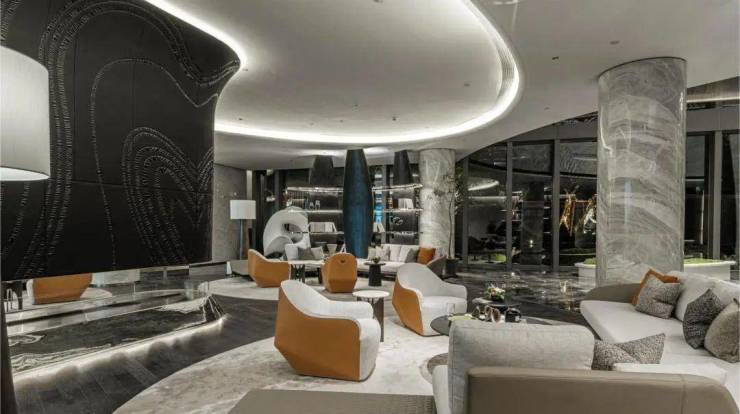 现房交付的都会中心,一切美好都在日常上映。驱车从吊顶饰有灯带的明朗地库进入,电梯上来,便是面积约1300㎡、挑高约9米的超级酒店式大堂。黑白灰大理石的底色,局部以棕色和金属铜色擦亮。上空漂浮的“潮汐”装置和船形雕塑呼应,以“一帆风顺”的设计寓意迎着着每一位业主。
