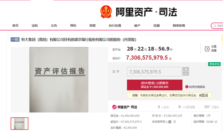 焦点财经讯 李泳青 8月8日,阿里拍卖平台显示,辽宁省沈阳市中级人民法院将于9月6日10时至9月7日10时止(延时的除外)拍卖恒大集团(南昌)有限公司持有的盛京银行的12.82亿股股份(内资股)。拍卖标的物评估价为75.63亿元,起拍价73.07亿元,增价幅度200万元。
