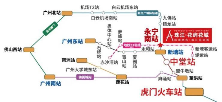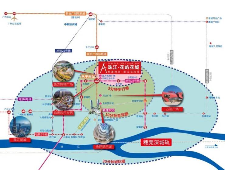 从项目步行即达永宁南站,新白广城轨(建设中)、地铁23号线(规划中)同样设站于此。新白广城轨通车后,从项目出发可乘坐新白广城轨直达白云机场;2站黄埔,3站天河;另外,可换乘穗莞深城轨直达东莞、深圳。