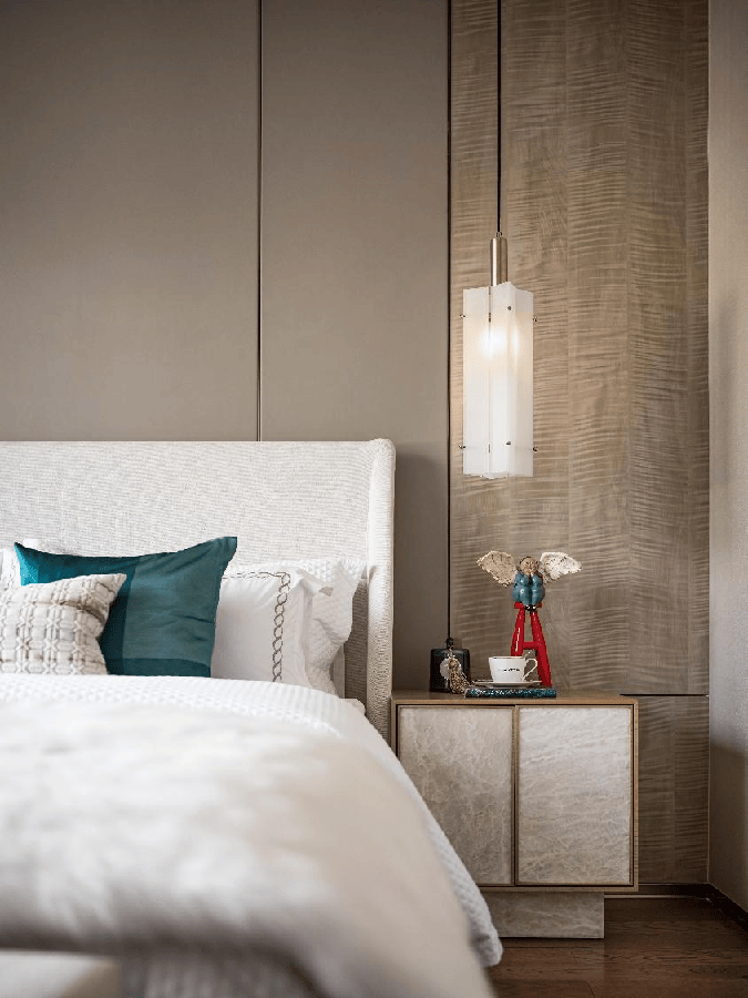 至于卧室,墙面则是一整块的真丝无缝墙布,稳定性高,避免开裂,品质堪比五星级酒店。