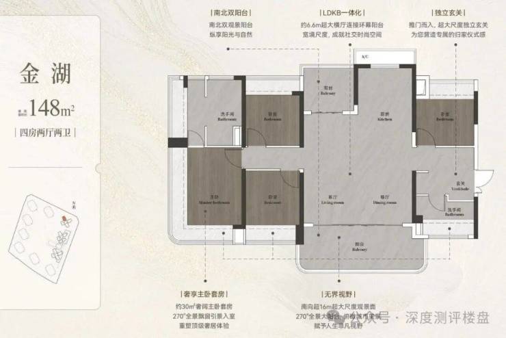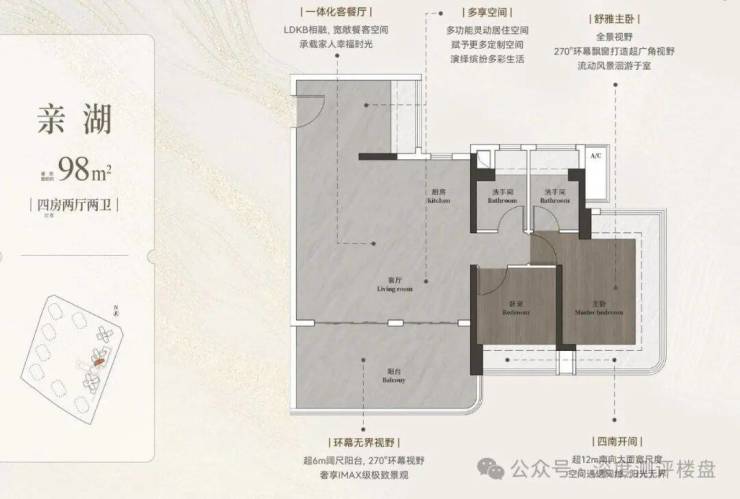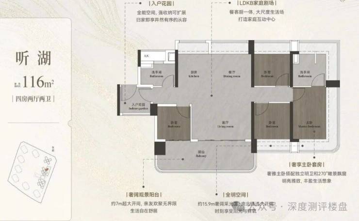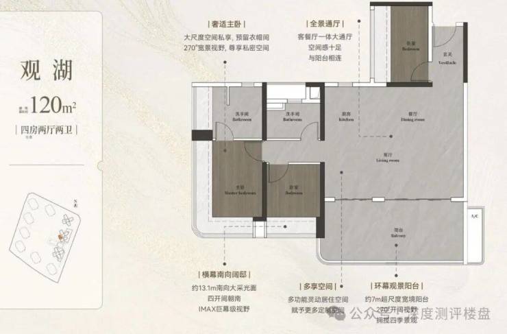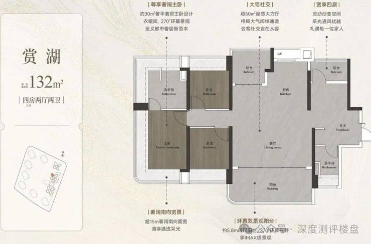 132㎡户型配备环幕双景阳台,270°视野尽收湖景与园景。