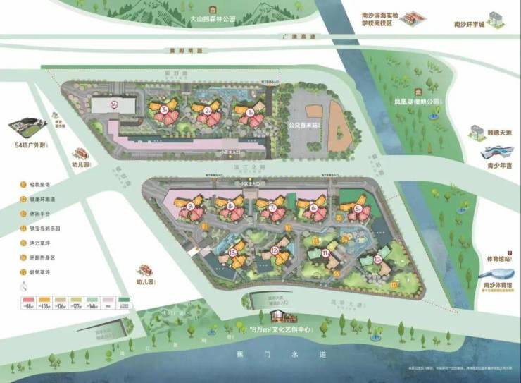 项目东北侧有大山乸森林公园,西侧就是约600米宽蕉门水道,一桥之隔则是南沙未来灵山岛CBD。