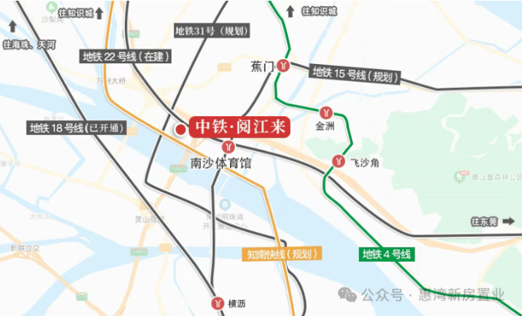项目离地铁较远,距离目前最近的黄阁、蕉门站直线距离都有3公里,公交接驳大概4-5站。不过附近有规划广州地铁15号线南沙体育馆站,但距离该线落地还需时间。