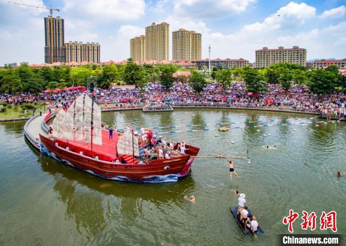 “关于水上掠鸭,相传是民族英雄郑成功在泉州安海港操练水师的练兵活动。”据水上“掠鸭”项目负责人颜呈智介绍,该项目后来成为流传于福建晋江安海古镇的端午节水上竞技运动。在安平桥墩或船上横架一根涂抹油脂的长竹竿,末端悬挂一个内放白鸭的篾笼子。参赛者在众人的鼓劲声中,小心翼翼地赤足过圆滑的竹竿,谁能够走到尽头并探笼取鸭,即挑战胜利。此活动可是集健身、冒险与娱乐为一体的项目,备受人们喜爱而沿袭不衰。