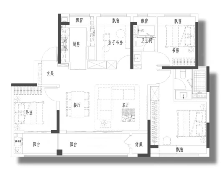 该户型同样也是全卧飘窗。