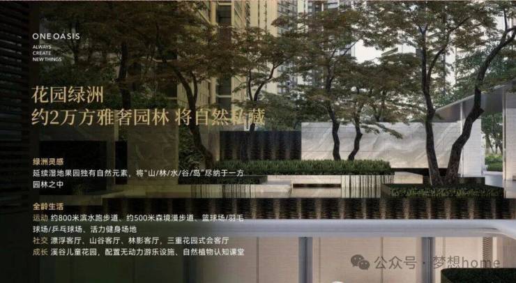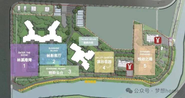 整个滨水园林包括了5大功能区,主入口的林溪港湾、拾阶云台、漂浮会客庭院、亲子儿童乐园(即溪谷花园)、配置羽毛球和篮球场的悦动之港,真正做到了一步即一景。