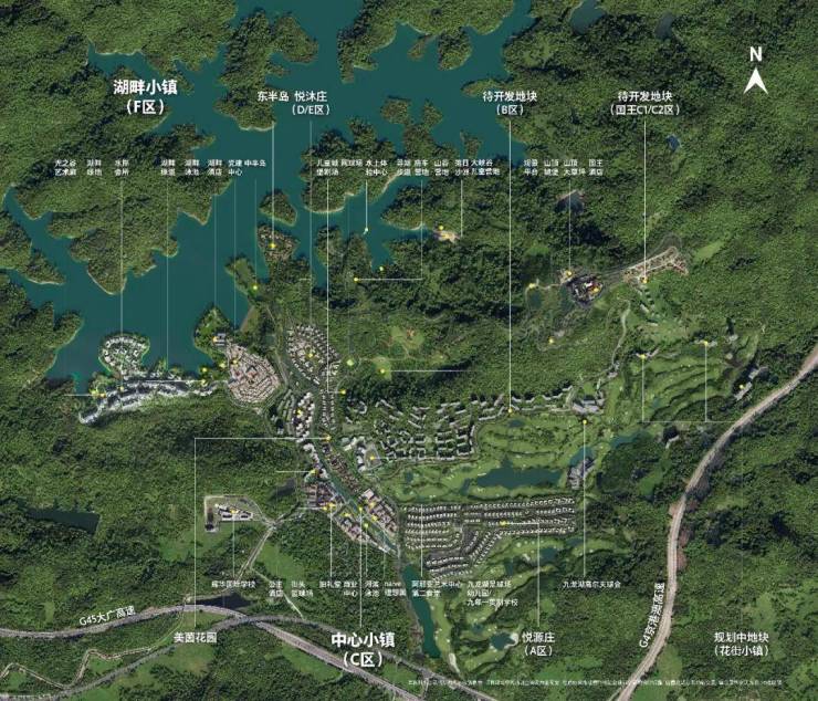 中旅阿那亚九龙湖是一个物业属性丰富的超大社区,包括:已开发悦源庄(A区)、悦沐庄(D区/E区)、美茵花园、东半岛等区域;正在热销的中心小镇(C区)、半山湖岸(F区),待开发的B区、国王区等,100万㎡的建筑体量将成就又一个旅游地标。