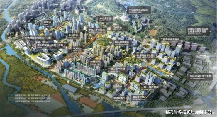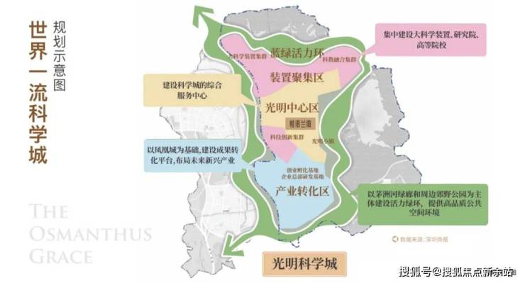 光明布局规划“一心两区”,“一心”即光明中心区,建设科学城的生活服务中心,集聚商业、居住、大型公共服务设施等顶级配套。