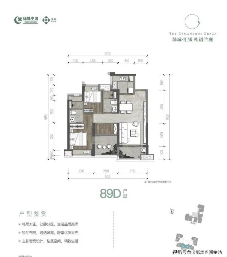 89㎡的3房2厅2卫(二期C-1户型),设计的是经典竖厅格局,客厅3.4米开间约12.92平,LDKB一体化,动静分区,分别做到了主卧12.3㎡/次卧10.36㎡/次卧7.68㎡(包含墙体飘窗),U型厨房,卫生间干湿分离,得房率:72.97%(不含赠送),阳台约5.26平西北或东南朝向。套内面积64.7㎡+赠送面积8.79㎡=实用面积73.49㎡,加上赠送后得房率约82.87%。