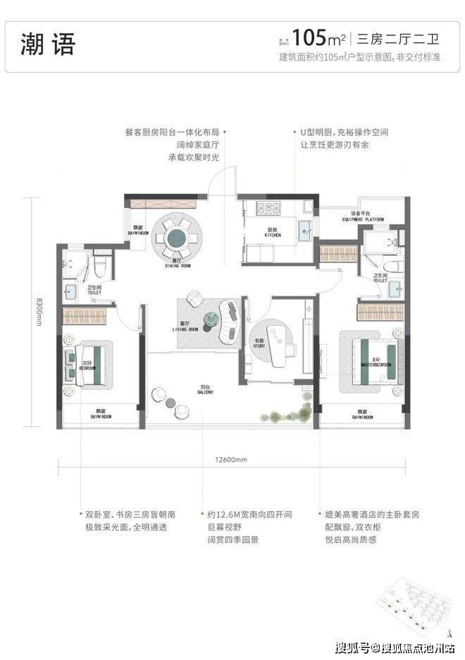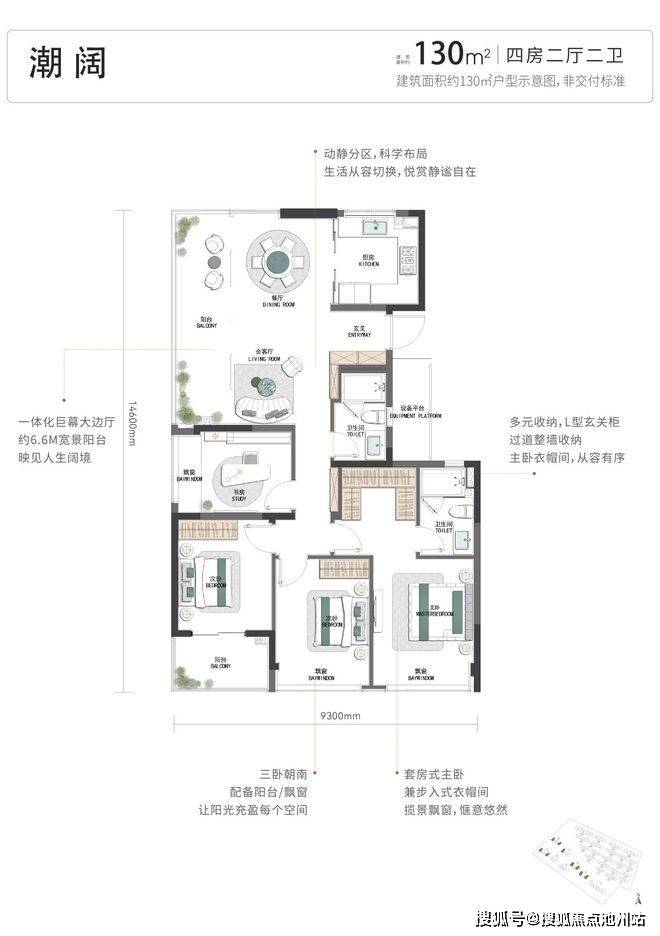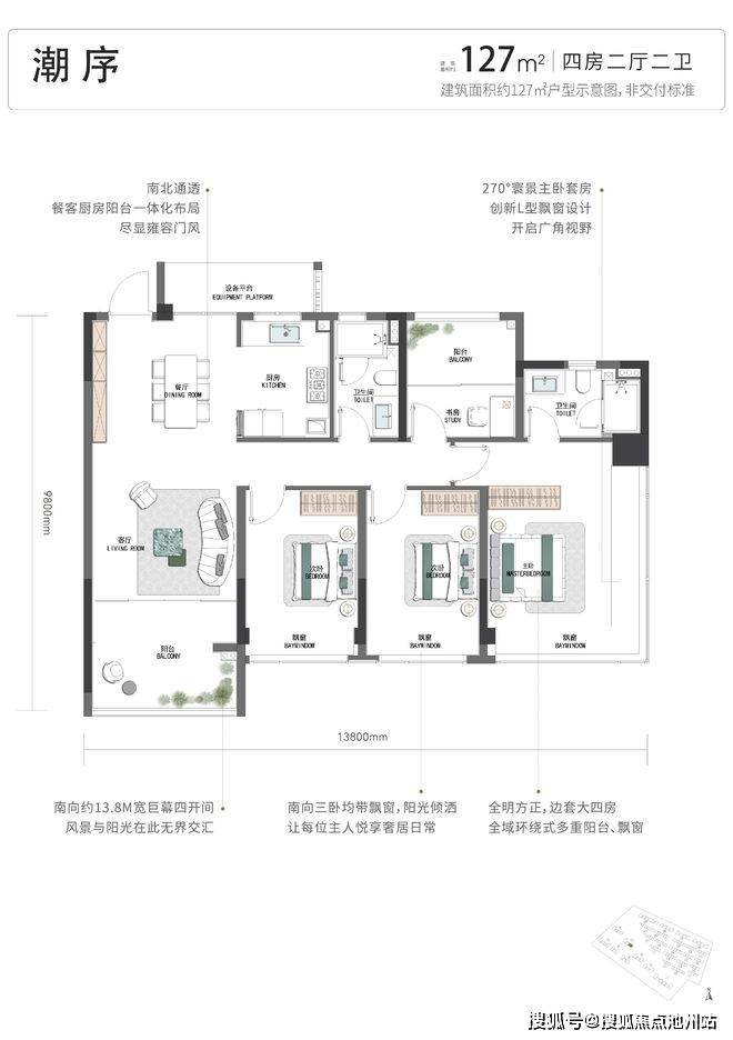 第三,它的户型也非常能打。首开的7#楼,三个户型实际得房率均在90%以上,起步建面约105㎡的三房,做到了四开间朝南,南向面宽约12.6米,实际体感完全不输市面上120方;建面约130㎡的四房,更有270度观景大边厅。