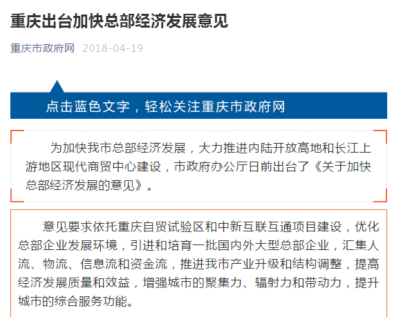 2018年,重庆市政府办公厅出台的《关于加快总部经济发展的意见》中,就明确提出:加快重庆市总部经济的发展,大力推进内陆开放高地和长江上游地区现代商贸中心建设。