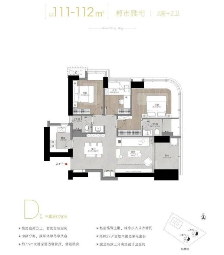 02/03 D户型——建面约111-112㎡3房2卫 :经典竖厅户型,东南朝向,看城市景观。户型格局方正,全明设计。客厅拥有约3.45米开间,与餐厅、阳台一体化连通,空间感开阔。主卧区是亮点,约23㎡包含步入式衣帽间和干湿分离主卫,并享有270°采光。