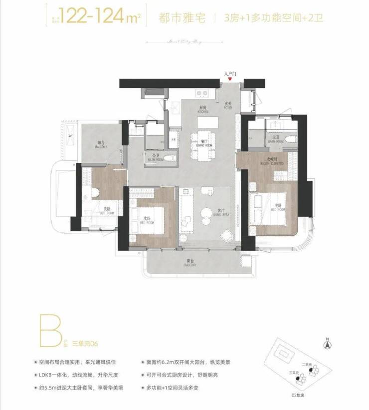 06 B户型——建面约122-124㎡3+1多功能空间 : 双龙抱珠户型,次卧带阳台。西北朝向看绿地公园及花园。虽然是125㎡户型中总价最低的,但仍保持高标准的空间尺度和配置,适合注重实用性的改善家庭,属于性价比之王。