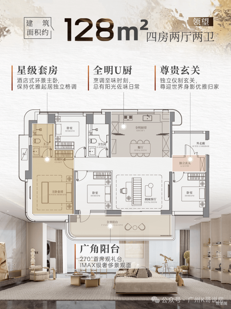 以建面约128㎡户型为例,项目用最小面积内实现了东南向、南北对流的改善型四房,让每一空间都物尽其用。