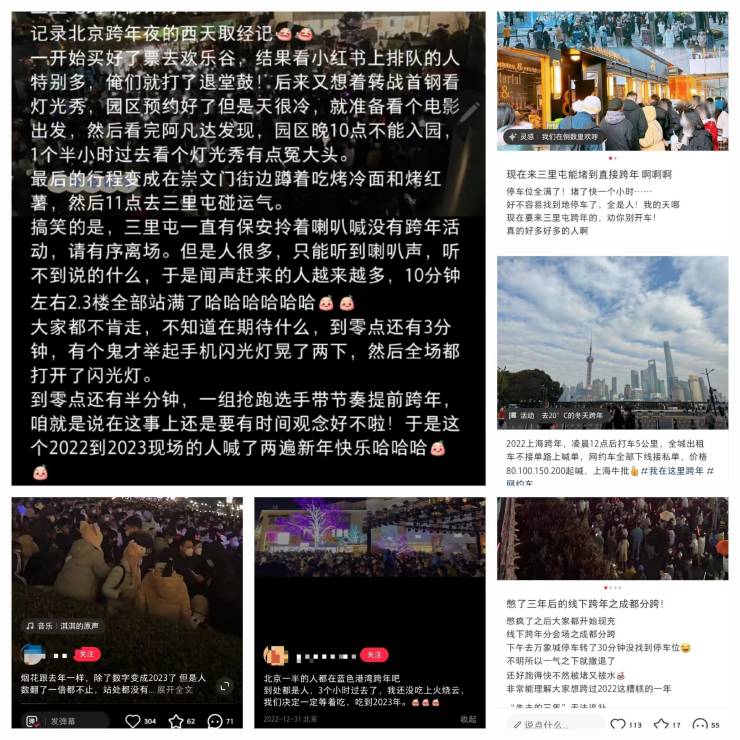 安排了跨年活动的商圈就更不必说。“难道半个北京的人都来了蓝色港湾跨年?”“三个小时了还没有吃上火烧云,决定一直等,吃到2023年”“合生汇里也是乌泱乌泱的,但是有种复活的感觉”“线下跨年之成都分跨,去万象城停车转了30分钟没找到停车位”“上海跨年,深夜12点后打车,出租车都在路上喊单”……