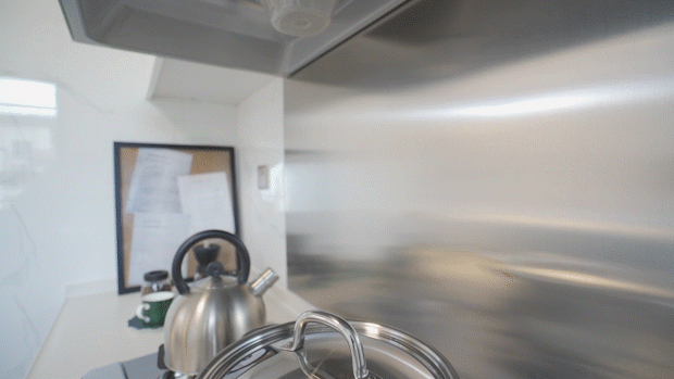 灶台墙面采用一整块不锈钢板,方便油污清理: