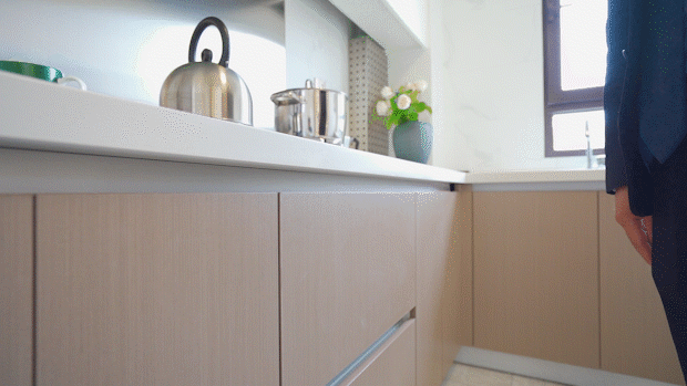 你打开抽屉柜,再关回去,阻尼铰链会缓冲柜板关闭力度,既静音,又防夹手。