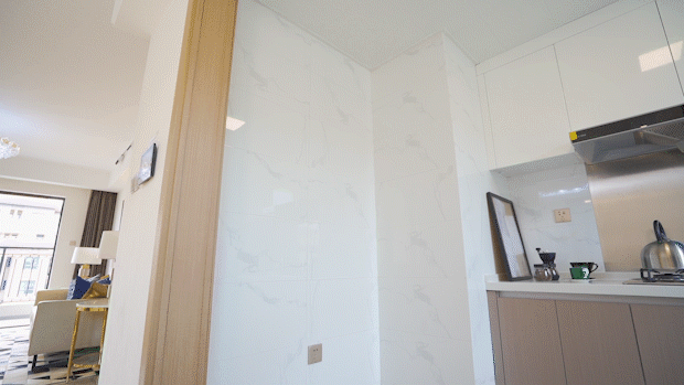 厨房很精致,移门是上滑轨的,避免上菜脚下磕绊,也方便打扫。