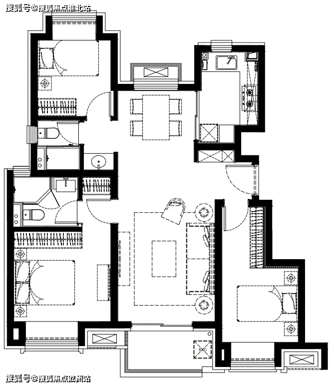 户型三开间朝南,是一个经典的飞机户型,好处是三个卧室在三个方位,互不打扰。