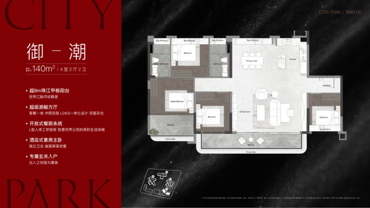 该栋为25层高,两梯三户设计,只有两个面积段,120㎡和140㎡,户型做得不错,在景观展现上用了功,极大程度去放大观江面,比方说超宽阳台、L型主卧转角飘窗、客厅预留观景飘窗等等,主打改善户型,2025年9月整体交房。