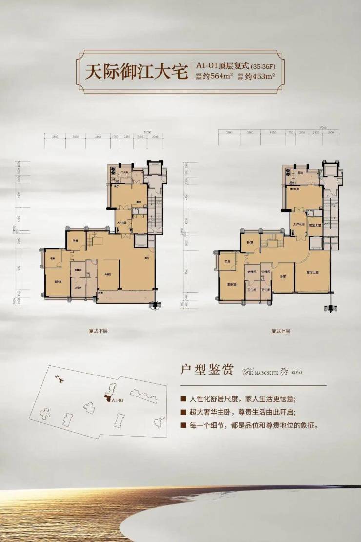 楼王华玺:A6栋1栋约32层高的版式高层洋房。四梯两户,户型面积约478㎡的超奢华五房户型。与B11同为楼王单位,户户南北通风对流,采光景观极佳,一线无敌江景;每户均特设私家入户花园,超大开间,超大阳台。