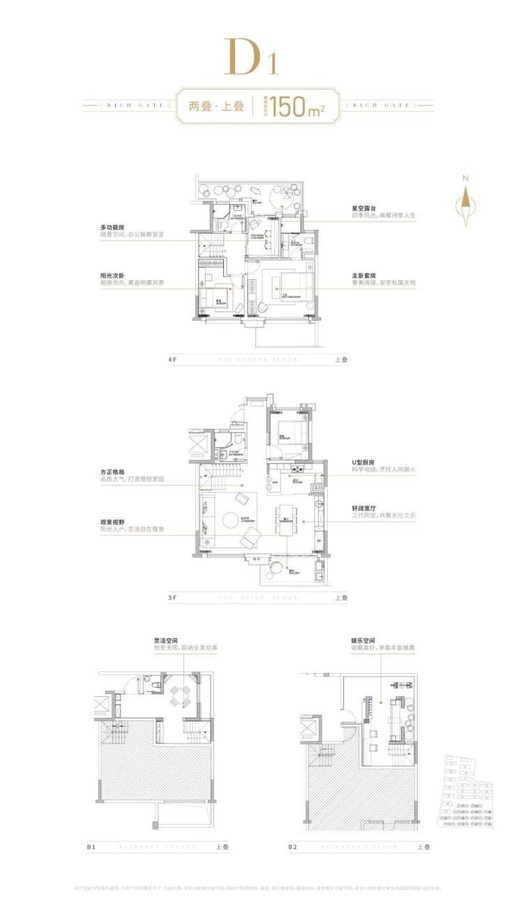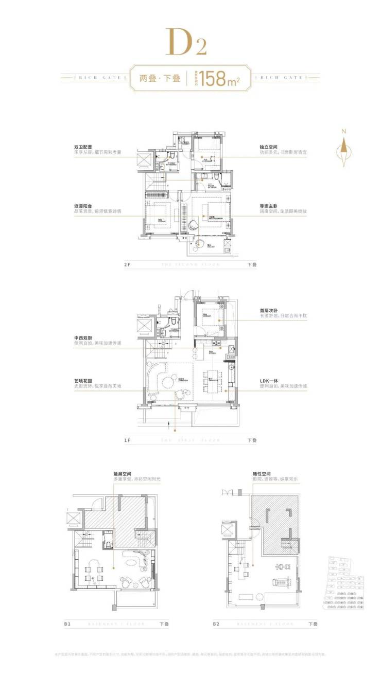 更重要的,项目的两叠产品拥有着媲美联排的丰富灵动空间,上叠和下叠都配备地下室,且均为双层格局的地下室空间。下叠南花园,北面入户花园;上叠北花园,露台,坡屋顶空间。