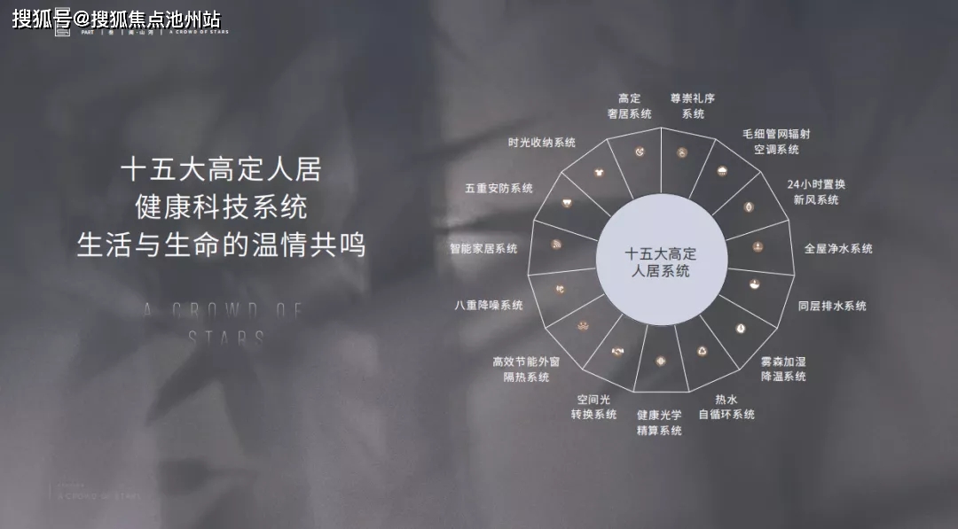 项目从“声光水气品”生命五感维度出发,定制了服务于居住健康与舒适性的“十五大高定人居系统”