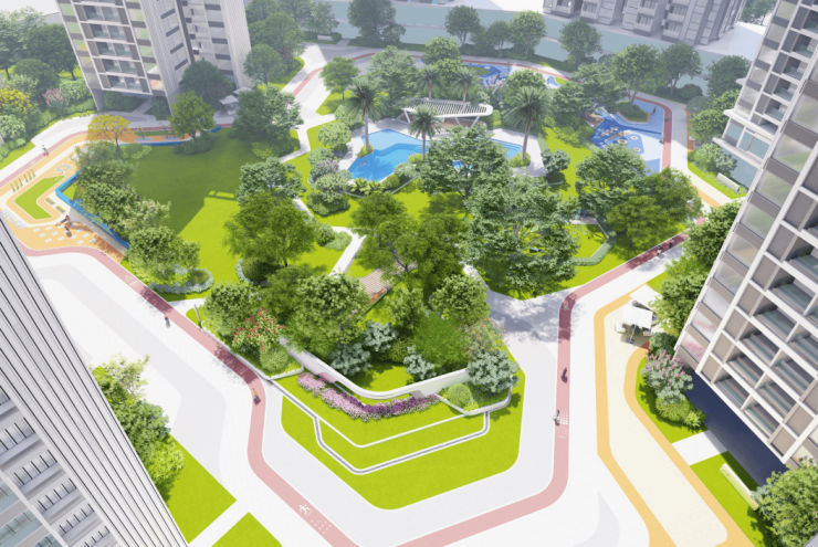中心园林采用多种珍品树种打造富有层次感的园林景观,并设有主题星空游泳池、多种亲子互动器械组合而成的星空乐园、亲近自然的林下书吧、爱宠人士专属的萌宠乐园、适合年轻人锻炼的轻舞健身区等,创造自然与科技的梦想栖居。